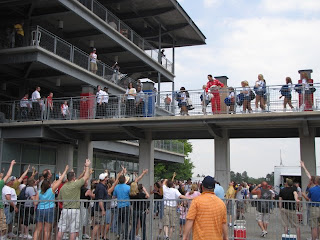 Esta foto mostra o momento no qual Hélio Castroneves ( que como Jorge Benjor, que era Jorge Ben, mudou a grafia do nome), joga um boné para os fãs.
